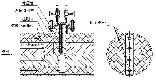 阿牛巴流量計由檢測桿、取壓口和導(dǎo)桿組成。阿牛巴的檢測管截面形狀分為圓形、菱形、橢圓形等多種結(jié)構(gòu)。如圖所示。